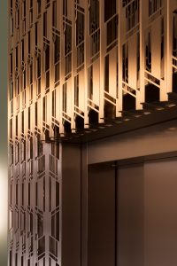 Showing the design of the lift surround incorporating a nostalgia for lift designs from the Art Deco era